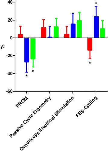 4種類の運動は他動的ROM、他動的自転車エルゴメーター、大腿四頭筋電気刺激、機能的電気刺激(FES)サイクリング。